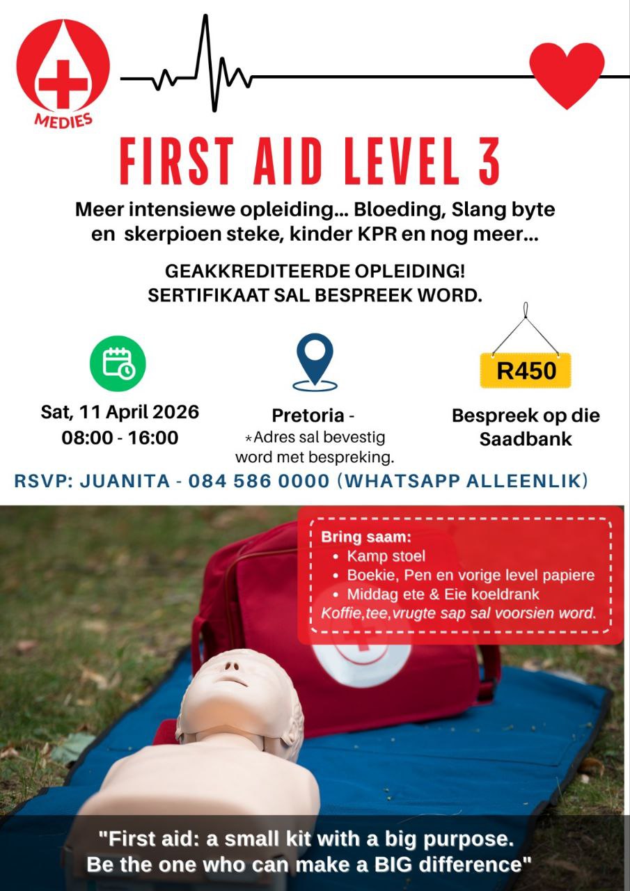 Mediese Opleiding 2026! First Aid Level 3 is ons volgende opleiding.